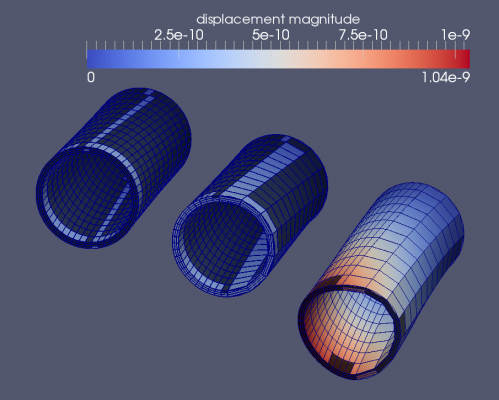 In the picture below the displacement of the cylinder is shown. The left cylinder has a symmetrical mesh (23x23 tangential) and the right picture is asymmetrical meshed (7x23). Both cylinder have roughly the same rotation at the bottom axial plane: the displacement in tangential direction is of the order of 3.1e-10.