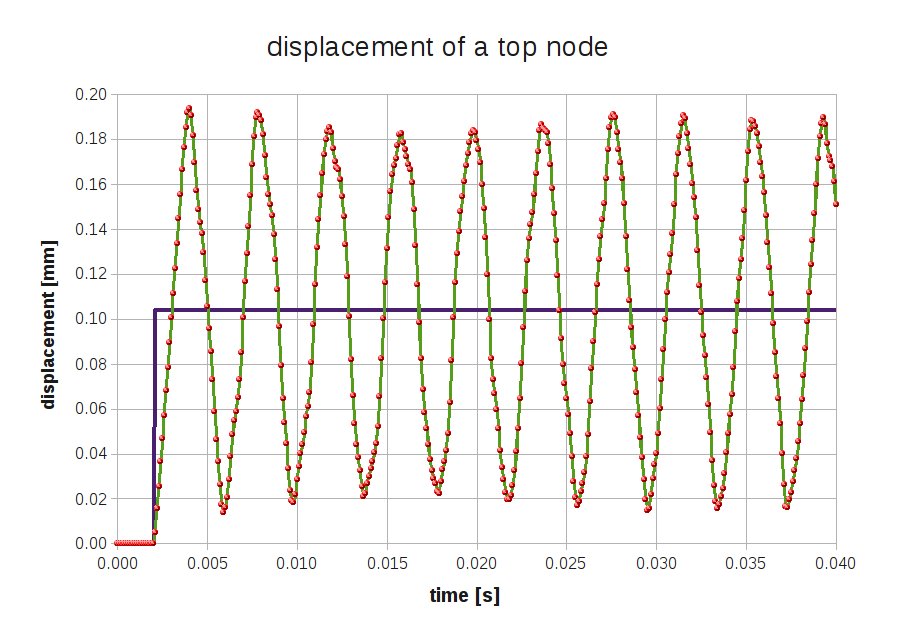 The time response of a top node is given in the picture below. The resonance frequency nicely corresponds with the previously determined 255 Hz, ie. the time of a single sine wave is about 4 ms. Note that the system is undamped.